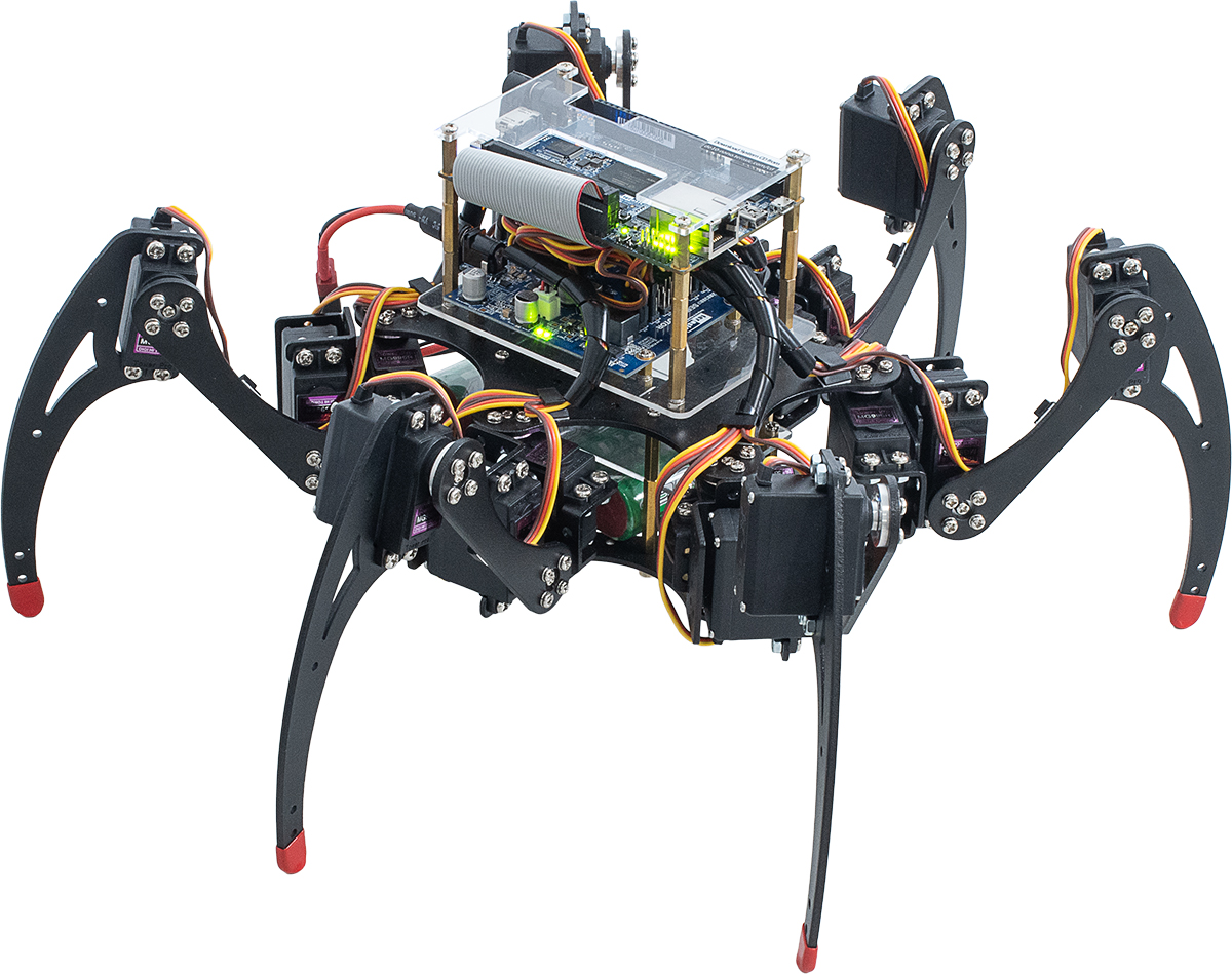 The Terasic Spider is a six-legged walking robot which is driven with 18 servo motors. These 18 servo motors are controlled by PWM signals generated from the DE10-Nano board embedded inside the Terasic Spider. The Terasic Spider itself can be remotely controlled by a bluetooth enabled host. From the host, we can control the Terasic Spider to move in four directions, swing based on the g-sensor data, and even complete a dance with pre-defined movements.