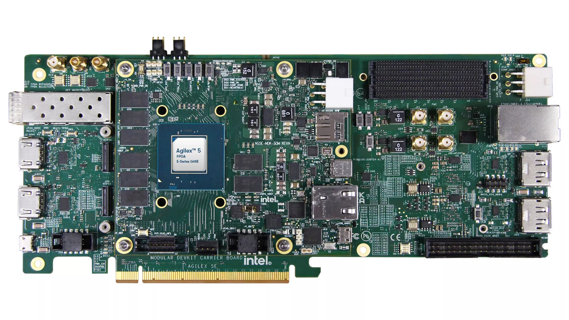 Agilex™ 5 FPGA E-Series 065B Modular Development Kit delivers a complete prototyping and reference platform design environment that includes both hardware and software. It is a general-purpose evaluation board in PCIe form factor with HPS hardware features enabling you to develop industrial, video, and other embedded and edge applications.