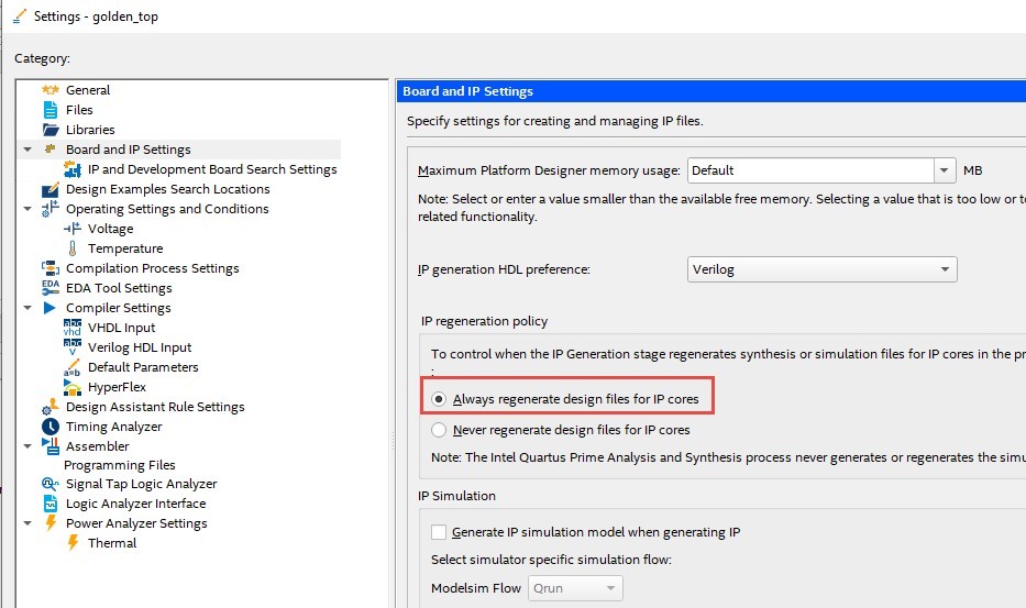 We were able to successfully compile and run all FPGA and SoC designs provided with the DE25-Standard distribution. These designs exercise the HDMI, IR, analog-to-digital converter, G-sensor, DRAM, and audio interfaces, among others. The designs provide a good starting point for student projects. We ran into a small issue using some of the designs which require intellectual property (IP), although the issue was quickly addressed by enabling the “Always regenerate design file for IP cores” flag in Quartus, as shown below.