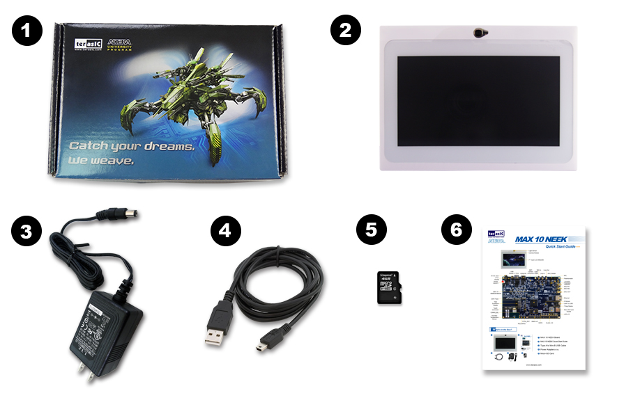 MAX® 10 NEEK 分页 5. 包装内容 1. 产品橱窗 2. 产品规格 3. 元件配置 4. 设计资源 5. 包装内容 6. 立即购买 MAX® 10 NEEK 包装盒 MAX® 10 NEEK 开发板 电源变压器 (5V/3A) 1.8m USB转接线 (Type A to Mini-B) MicroSD 记忆卡 MAX® 10 NEEK 快速入门手册 Quartus design software license is not included in this kit. 设计资源 立即购买