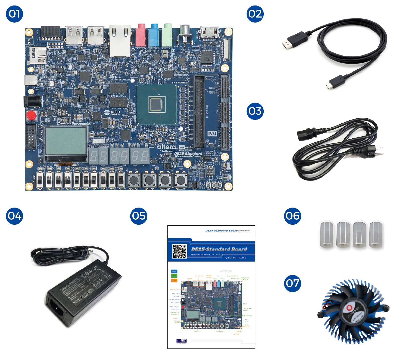 DE25-Standard Development and Education Kit Page 5. Kit Contents 1. Overview 2. Specifications 3. Layout 4. Resources 5. Kit Contents 6. Demo 7. Order Now DE25-Standard Board Type-C USB Cable AC Power Cord 12V 36W Power Supply Quick Start Guide Four Silicon Footstands Fan (Installed) Resources Demo