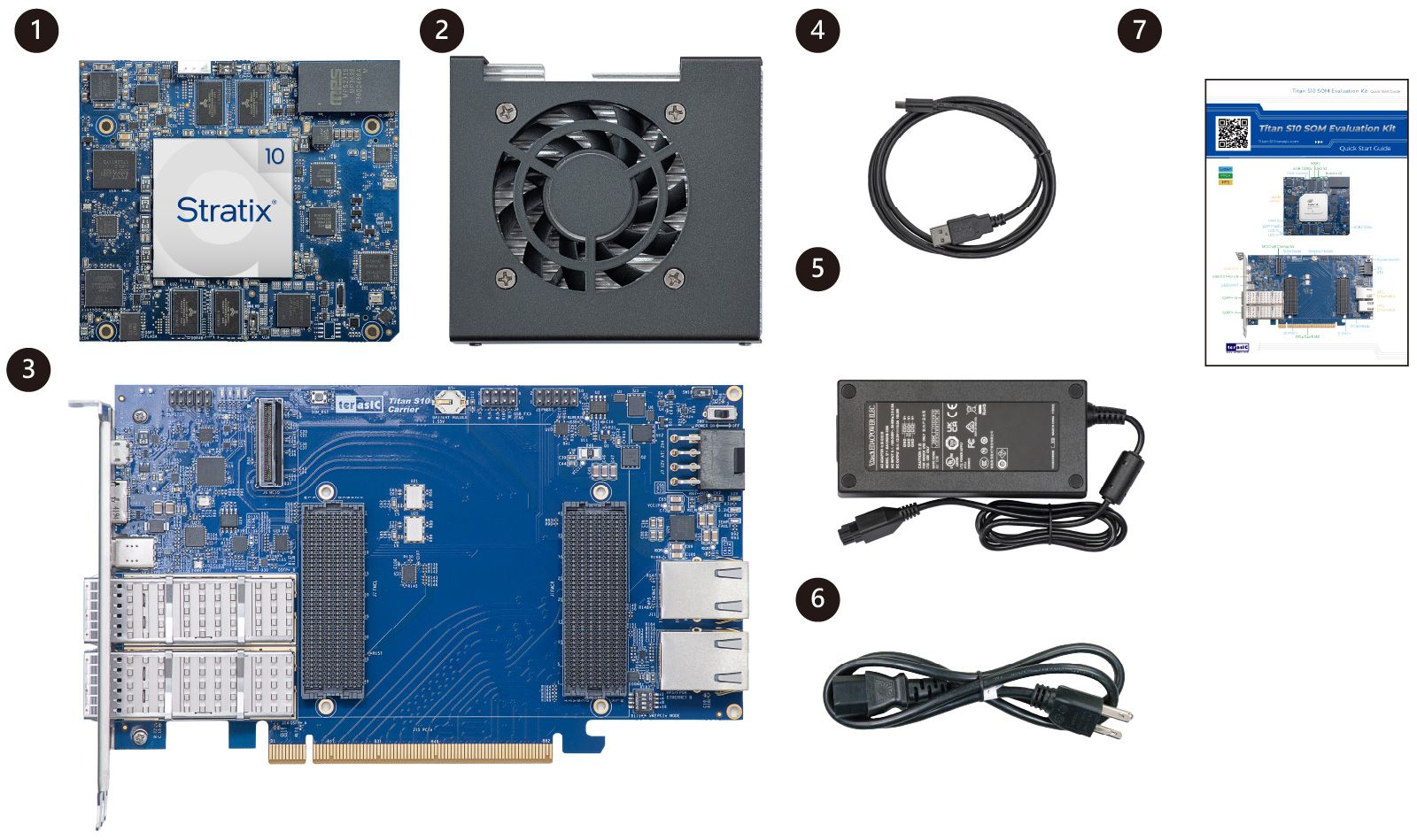 Titan S10 SOM Page 5. Kit Contents 1. Overview 2. Specifications 3. Layout 4. Resources 5. Kit Contents 6. Order Now Titan S10 SOM Titan S10 SOM Active Heatsink (Installed) Titan S10 SOM Evaluation Kit Titan S10 SOM (Installed) Active Heatsink (Installed) Titan S10 Carrier Board Type A to Type C Cable DC Power Adapter (12V) AC Power Cord Quick Start Guide Resources Order Now
