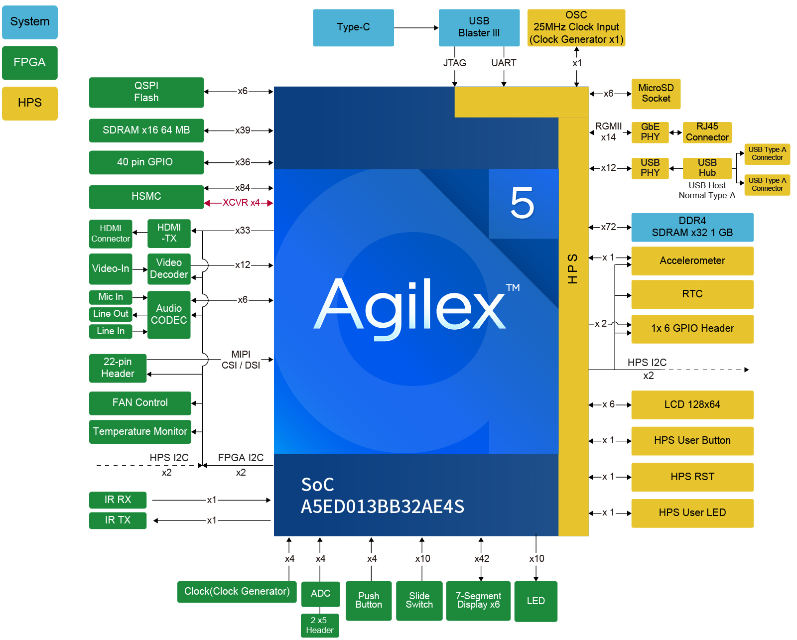 - DDR4: 1GB DDR4 with 32-bit data bus (no ECC), shared with HPS.