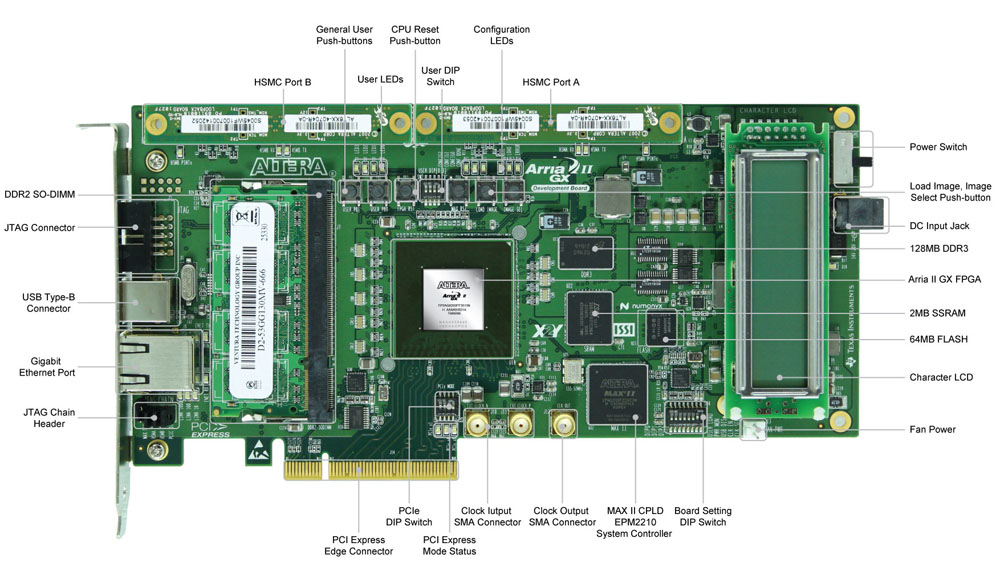 Arria II GX-260 FPGA Development Board Page 3. Layout 1. Overview 2. Specifications 3. Layout 4. Resources 5. Kit Contents 6. Order Now Sizeļ¼216X107mm Specifications Resources