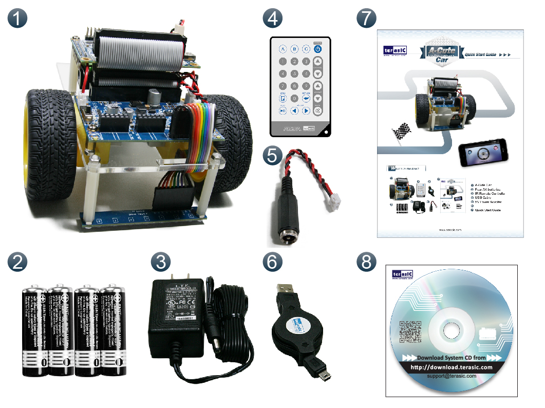 A-Cute Car Robotic Kit Line Following Robot Accelerated by FPGA Page 6. Kit Content 1. Overview 2. Specifications 3. Layout 4. Resources 5. Demo 6. Kit Content 7. Order Now A-Cute Car Four AA batteries 5V Power Adapter IR Remote Controller DC Adapter Cable USB Cable Quick Start Guide System CD Download Guide The accessories might not look exactly the same as shown on this webpage Demo Order Now